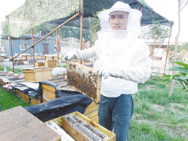 6月24日,沈丘縣付井鎮(zhèn)九里村的退伍軍人蘇尚方,正小心翼翼地從蜂箱里取出蜂蜜板,準(zhǔn)備采收蜂蜜。“我養(yǎng)了120多箱蜜蜂,年產(chǎn)蜂蜜3000多公斤,經(jīng)濟(jì)收入十分可觀?!碧K尚方說,他專門成立了蘇家養(yǎng)蜂專業(yè)合作社,帶領(lǐng)當(dāng)?shù)刎毨粢黄鹈撠氈赂弧Vx辛凌 攝