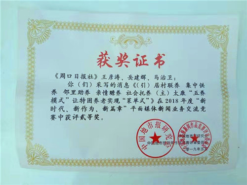河南新聞獎(jiǎng)是河南省新聞界最高獎(jiǎng)。日前,經(jīng)過(guò)初評(píng)、復(fù)評(píng)、定評(píng)、公示等一系列環(huán)節(jié)后,《周口日?qǐng)?bào)》二版頭題刊發(fā)的《太康“五養(yǎng)模式”讓特困養(yǎng)老實(shí)現(xiàn)“菜單式”》(作者:王彥濤 岳建輝 馬治衛(wèi) 編輯:魏東 李鳳霞)喜獲河南新聞獎(jiǎng)一等獎(jiǎng),成為周口市唯一獲得一等獎(jiǎng)的新聞作品。同時(shí),《太康“五養(yǎng)模式”讓特困養(yǎng)老實(shí)現(xiàn)“菜單式”》還榮獲了中國(guó)地市報(bào)新聞獎(jiǎng)二等獎(jiǎng),可謂“雙喜臨門”。
