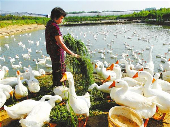 7月16日,沈丘縣周營鎮(zhèn)馬營村生態(tài)鵝養(yǎng)殖基地,工人正在喂養(yǎng)生態(tài)鵝。近年來,該鎮(zhèn)充分利用得天獨厚的生態(tài)環(huán)境優(yōu)勢,積極引導(dǎo)群眾發(fā)展訂單生態(tài)土雞、肉鵝、槐山羊等特色養(yǎng)殖產(chǎn)業(yè),全力促進(jìn)農(nóng)民增收致富。謝辛凌 攝