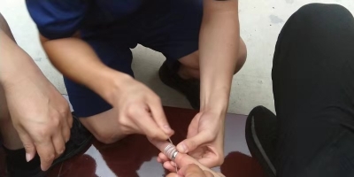 經過查看,由于尺寸不合適,該男子左手中指已經被戒指卡的出現充血,手指腫脹嚴重。考慮到用剪切器等器械剪戒指可能會傷到手指,指戰(zhàn)員利用纏線解線的方法,用細線穿過戒指在手指上纏繞,然后慢慢拉線,利用細線的滑潤效果幫助取下戒指,很快戒指被成功取下。