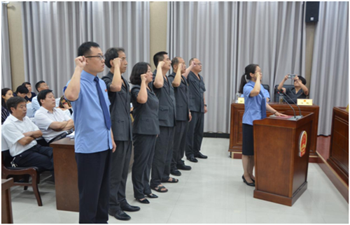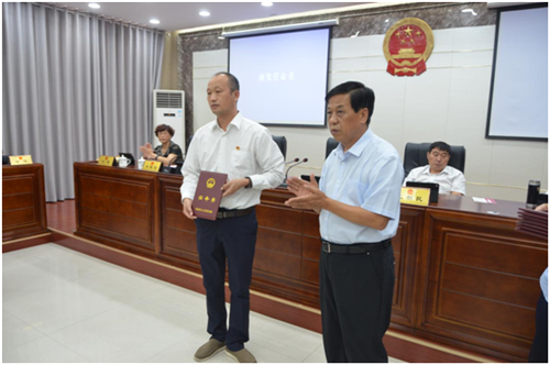 會(huì)議組織新任命的國(guó)家機(jī)關(guān)工作人員向憲法宣誓,李國(guó)際為新任命的國(guó)家機(jī)關(guān)工作人員頒發(fā)了任命書。
