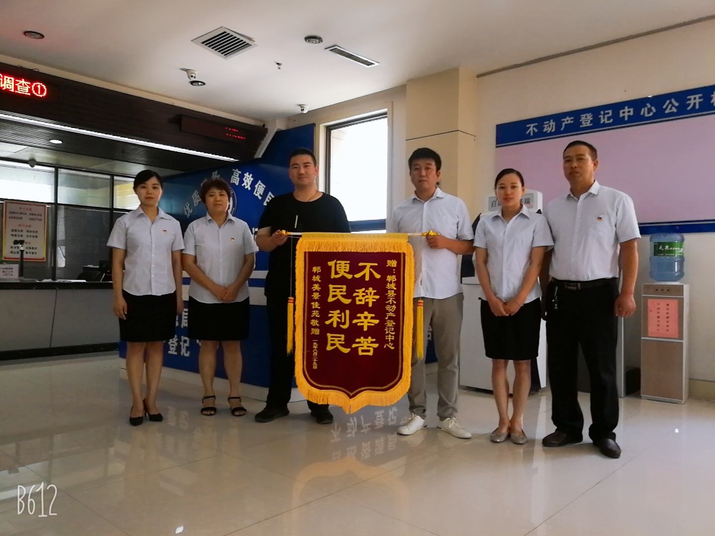 近日,河南博騏置業(yè)有限公司工作人員來到鄲城縣不動(dòng)產(chǎn)登記中心,將一面印有“不辭辛苦,便民利民”的錦旗送到了中心負(fù)責(zé)人手中,對(duì)不動(dòng)產(chǎn)登記中心真心為民的服務(wù)態(tài)度和高效的辦事效率表示感謝,點(diǎn)贊窗口“熱情、文明、高效”的服務(wù)。