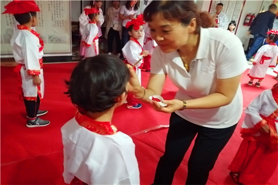 活動包含“朱砂開智”、誦讀《弟子規(guī)》、“擊鼓明志”、書畫展示、感恩五個環(huán)節(jié):第一個環(huán)節(jié)老師為孩子“朱砂開智”。用朱砂為剛剛?cè)雽W的孩子在額頭正中點上紅痣,又稱之為“開天眼”。寓意著孩子從此心明眼亮,好讀書、讀好書。第二個環(huán)節(jié)老師帶領大家誦讀《弟子規(guī)》。孩子們在老師及社區(qū)工作人員帶領下誦讀國學經(jīng)典《弟子規(guī)》,一起感受儒家經(jīng)典的道德教化魅力。第三個環(huán)節(jié)是“擊鼓明志”。擊鼓明志是結合中國傳統(tǒng)文化,讓孩子們通過擊打中國鼓,以鼓聲的清脆悅耳,來提高孩子的精氣神,激發(fā)孩子們的斗志,給孩子們建立濟世救人,胸懷天下的抱負,從而也讓孩子們表達出人生理想,為未來的人生目標努力奮斗?!拔议L大想當一名醫(yī)生,可以治病救人……我長大想當一名消防員,在著火的時候奔赴火場救人……我長大想當一名古箏老師,登上世界舞臺彈奏好聽的音樂……”孩子們依次擊鼓并說出了人生理想抱負。第四個環(huán)節(jié)是書畫展示。繪畫創(chuàng)作讓孩子們靜定心靈,激發(fā)智慧。第五個環(huán)節(jié)是感恩環(huán)節(jié),感恩老師、感恩父母、感恩天地萬物,以此培養(yǎng)孩子們向善向上的健康思想,增強他們的社會責任感,進一步引導他們常懷感恩之心。