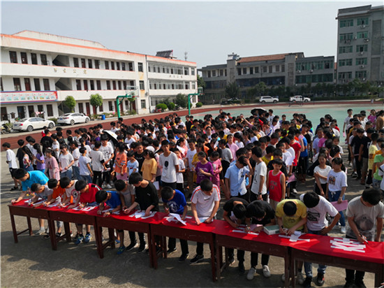 7月2日,沼山中學(xué)師生齊聚學(xué)校操場,舉行“小手拉大手 同創(chuàng)文明城”活動啟動儀式?;顒蝇F(xiàn)場,同學(xué)們整齊列隊,依次上前,鄭重地在橫幅上簽上自己的名字,吹響學(xué)校新一輪創(chuàng)建攻堅號角。