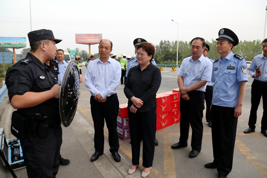 離70年大慶越來(lái)越近,喜慶的氣氛越來(lái)越濃,一線執(zhí)行安保工作的公安民警肩上的擔(dān)子也越來(lái)越重。9月24日下午,扶溝縣領(lǐng)導(dǎo)張穎波、詹凱、朱良杰、王霄靈及縣公安局局長(zhǎng)田豪杰等,來(lái)到鹽洛高速扶溝站親切看望在此執(zhí)勤的公安民警。