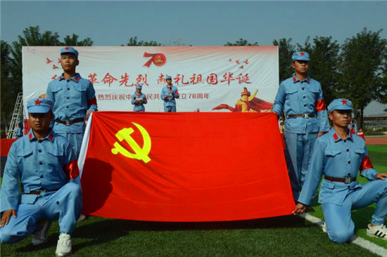 當(dāng)天上午,小朋友在家長和老師的帶領(lǐng)下,身穿紅軍軍服,手里揮動著小紅旗,鮮嫩的小臉蛋上貼著小國旗,雄赳赳氣昂昂地走在體育場上,邁著整齊堅(jiān)定的步伐,昂首挺胸,高唱國歌,共同祝福偉大的祖國70華誕。
