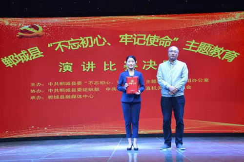 10月29日下午,由中共鄲城縣委“不忘初心、牢記使命”主題教育領(lǐng)導(dǎo)小組辦公室主辦,鄲城縣委組織部、縣直機(jī)關(guān)工委協(xié)辦,縣融媒體中心承辦的“不忘初心、牢記使命”主題教育演講比賽決賽舉行,鄲城縣委常委、組織部長、縣委“不忘初心、牢記使命”領(lǐng)導(dǎo)小組辦公室主任侯磊等出席并為獲獎(jiǎng)?wù)哳C發(fā)獎(jiǎng)?wù)伦C書。