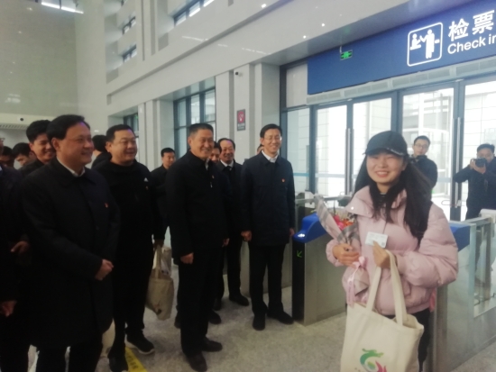 中午12時43分,呼嘯而至的G6655作為首趟列車準點駛進淮陽南站,90多位乘客依次興沖沖地走下列車?;搓柨h委書記馬明超、縣長王毅等為率先走出出站口的乘客代表送上布藝泥泥狗等禮物,歡迎他們乘坐首趟高鐵列車回家。