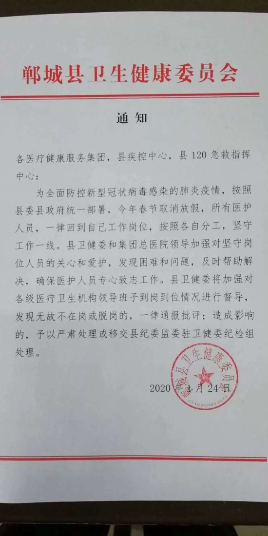 在全國疫情防控形勢(shì)較為嚴(yán)重情況下,衛(wèi)健委充分認(rèn)識(shí)到加強(qiáng)新型肺炎疫情防治工作的重要性和急迫性,于1月24下發(fā)取消全縣醫(yī)護(hù)人員春節(jié)假期的通知。要求所有醫(yī)護(hù)人員,一律回到自己工作崗位,按照各自分工,堅(jiān)守工作一線。