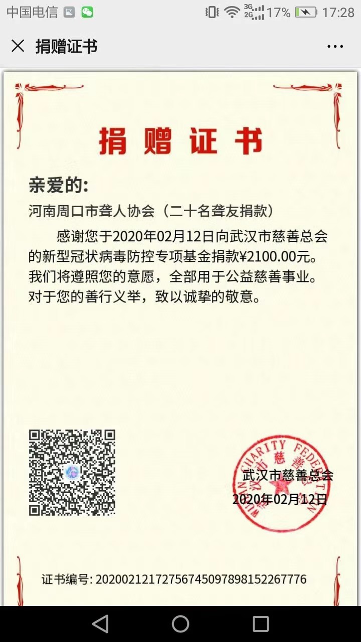 2月12日,2100元的捐款轉(zhuǎn)到了武漢市慈善總會(huì),這是來自河南周口市聾人協(xié)會(huì)20名聾友的一份愛心。
