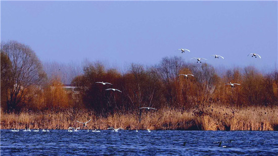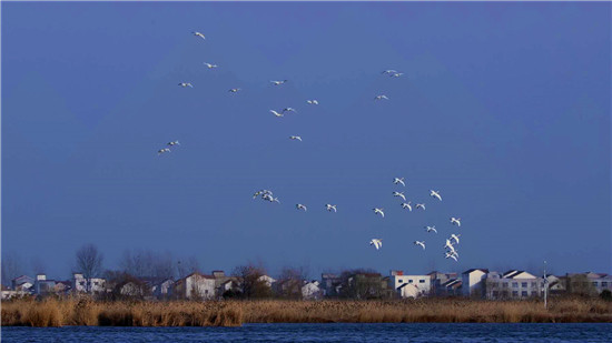 2月21日,50多只白天鵝在國家濕地公園淮陽龍湖自由游弋、展翅翱翔的美麗畫面被記者一一收入鏡頭。記者現(xiàn)場看到,初春的龍湖,天藍(lán)水碧,萬物萌動。這群白天鵝的到來,使萬畝龍湖一下子變得靈動起來。它們有的在水面上自由覓食,一副悠然自得的神態(tài);有的時(shí)而煽動翅膀,抖落長途跋涉的疲憊;有的飛向藍(lán)天,盡情享受著春日暖陽。為了不打擾這群“客人”,又能拍攝到相對清晰的圖片,記者環(huán)繞龍湖多處踩點(diǎn),用200mm鏡頭+2倍增距鏡,蹲守一天,最終在畫卦臺前湖岸向東南方向遠(yuǎn)距離拍攝到了這些美麗的畫面。