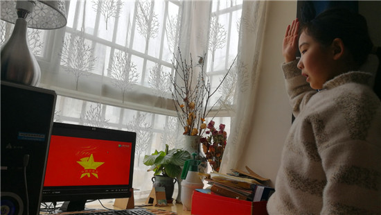 2月25日,周口市文昌小學(xué)三(5)班一名學(xué)生在家中敬隊禮、唱隊歌。自新冠疫情發(fā)生以來,周口市文昌小學(xué)通過網(wǎng)絡(luò)授課方式,使孩子們停課不停學(xué)。當(dāng)日,該校組織學(xué)生在網(wǎng)上觀看“河南省少先隊活動抗疫專題示范課”,讓孩子們學(xué)到了很多關(guān)于新冠肺炎的相關(guān)知識。