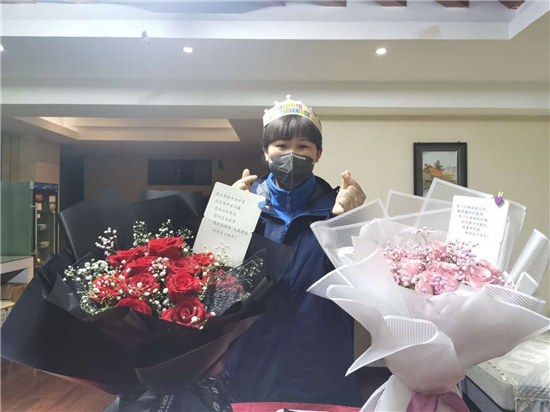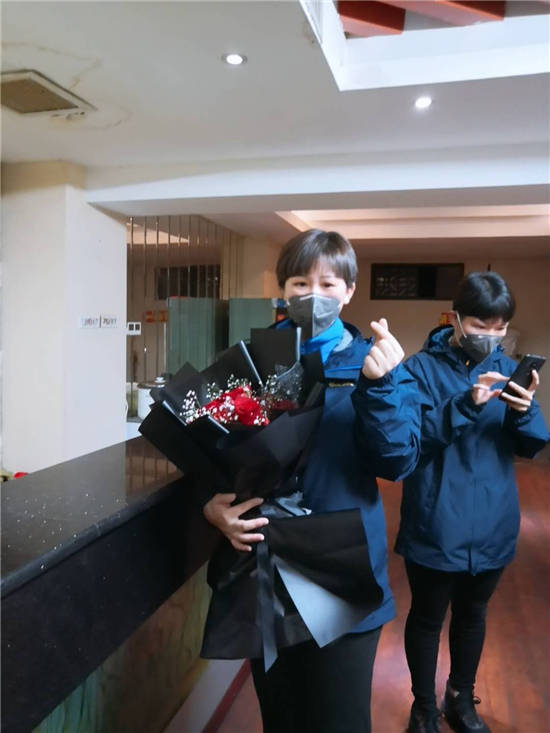 隊伍集合完畢,接下來的一幕令許聽聽始料未及。來自當(dāng)?shù)厣鐓^(qū)的工作人員,手捧蛋糕、鮮花,唱著生日歌,來到許聽聽面前,向她致以生日祝福。特殊時期,身處抗疫一線,忙于照顧病人,許聽聽此前對自己的23歲生日沒有任何憧憬,她告訴記者,其實(shí)她當(dāng)天沒想起來是她的生日,面對突如其來的生日祝福,許聽聽說:“當(dāng)時的心情既激動又感動?!?。