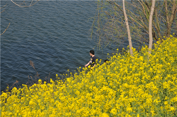 3月23日,市民在商水縣鄧城鎮(zhèn)沙河葫蘆灣水利樞紐附近欣賞油菜花。