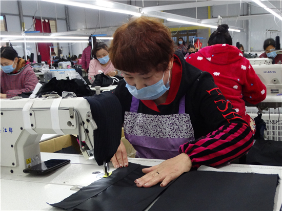 疫情不能放松,復(fù)工復(fù)產(chǎn)也要穩(wěn)妥推進(jìn)。連日來,沈丘縣婦聯(lián)鼓勵(lì)引導(dǎo)和組織廣大婦女群眾科學(xué)安全有序助力企業(yè)、農(nóng)業(yè)合作社、扶貧車間等復(fù)工復(fù)產(chǎn),確保戰(zhàn)"疫"扶貧兩不誤,為統(tǒng)籌推進(jìn)防疫戰(zhàn)和脫貧攻堅(jiān)戰(zhàn)貢獻(xiàn)巾幗力量。圖為沈丘縣周營鎮(zhèn)馬營村慧恩服飾有限公司來料加工扶貧車間內(nèi),女工們正在生產(chǎn)線上加工訂單服裝。