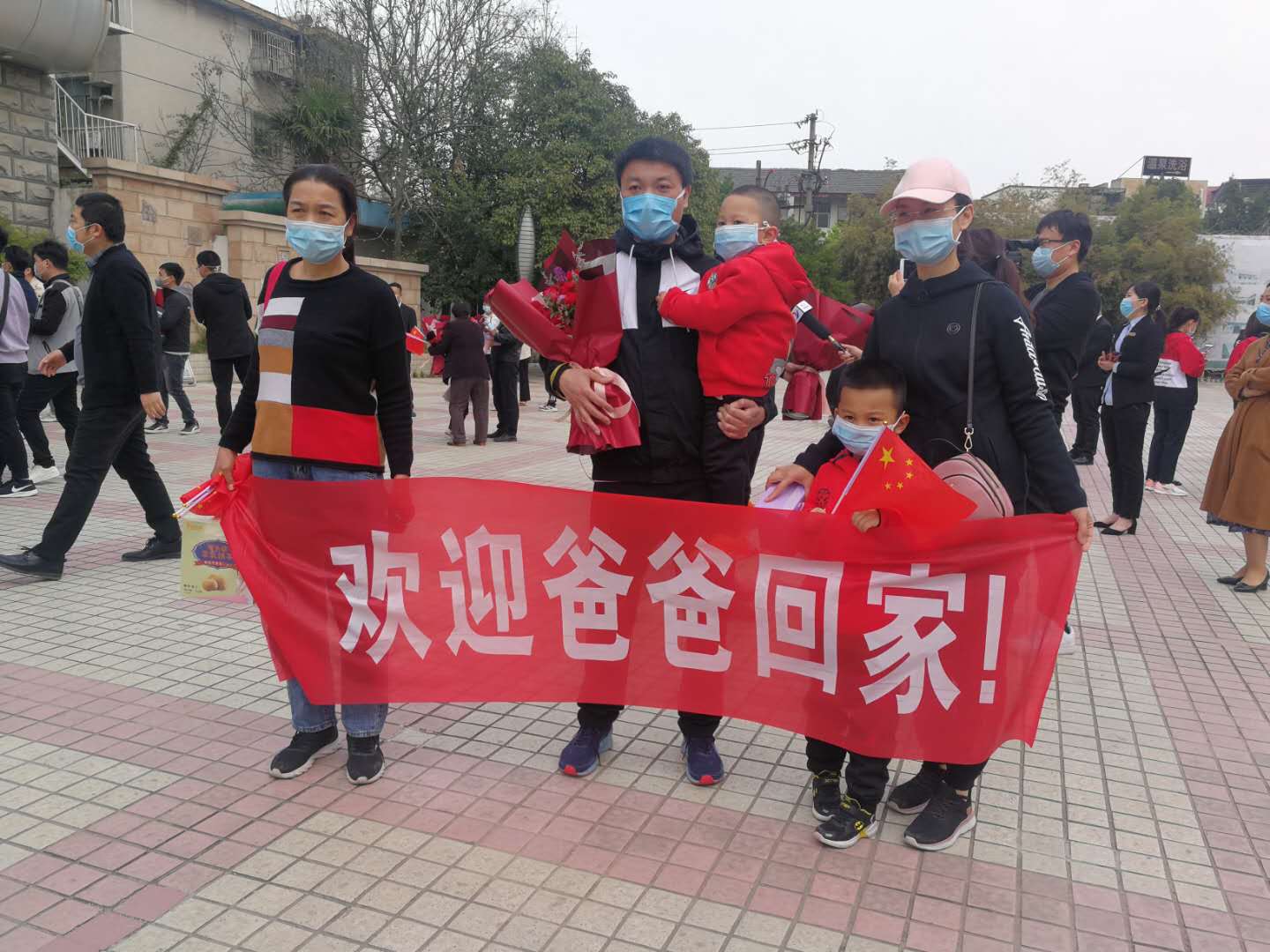 “歡迎爸爸回家”、“歡迎回家” 親人們、同事們、朋友們和自發(fā)趕來的市民早早守候在隔離休整點門口,等著迎接英雄回家。一束束鮮花、一條條橫幅都在向凱旋而來的勇士們表達(dá)著敬意和思念。