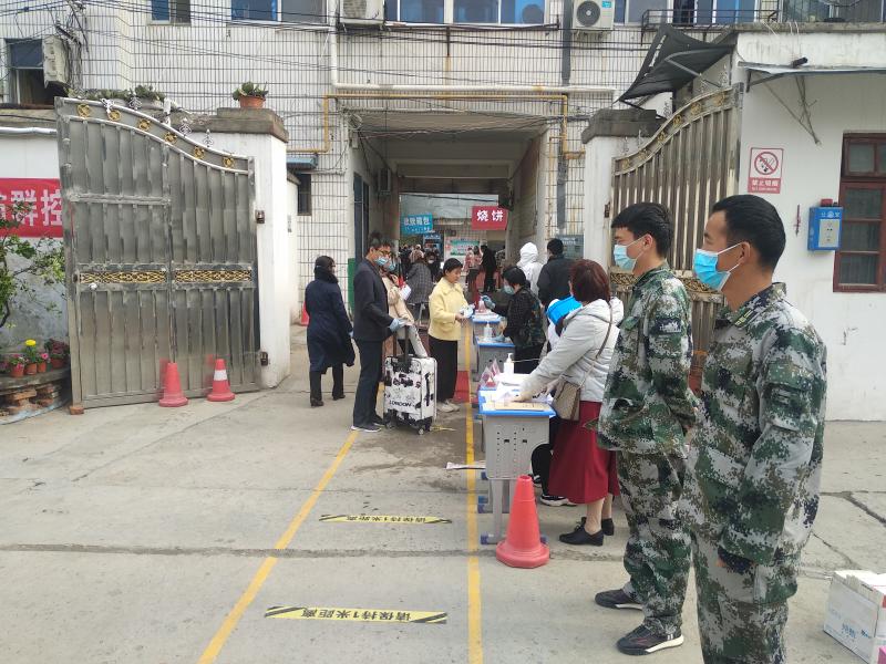“同學(xué)們,請(qǐng)排好隊(duì),與前面的人保持1米以上的距離。”4月20日上午,在鄲城縣華宇中學(xué),來自洺南街道基干民兵應(yīng)急分隊(duì)的民兵們正在現(xiàn)場(chǎng)維護(hù)秩序,幫助該校做好九年級(jí)學(xué)生復(fù)學(xué)入校防疫工作。