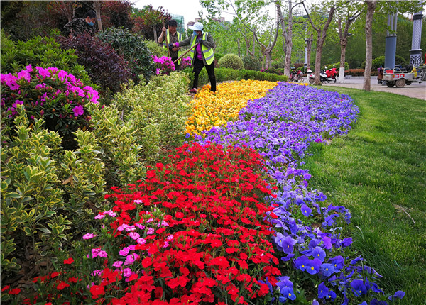 4月20日,在文昌大道道路綠化帶上,市政工人正在為栽種的花卉綠植補(bǔ)充水分。入春以來(lái),我市城區(qū)一直在進(jìn)行美化綠化,現(xiàn)在各個(gè)街道逐漸顯現(xiàn)出絢麗身姿。市民走在市區(qū)的每個(gè)街道都能看到各色花卉、綠植,很是養(yǎng)眼。