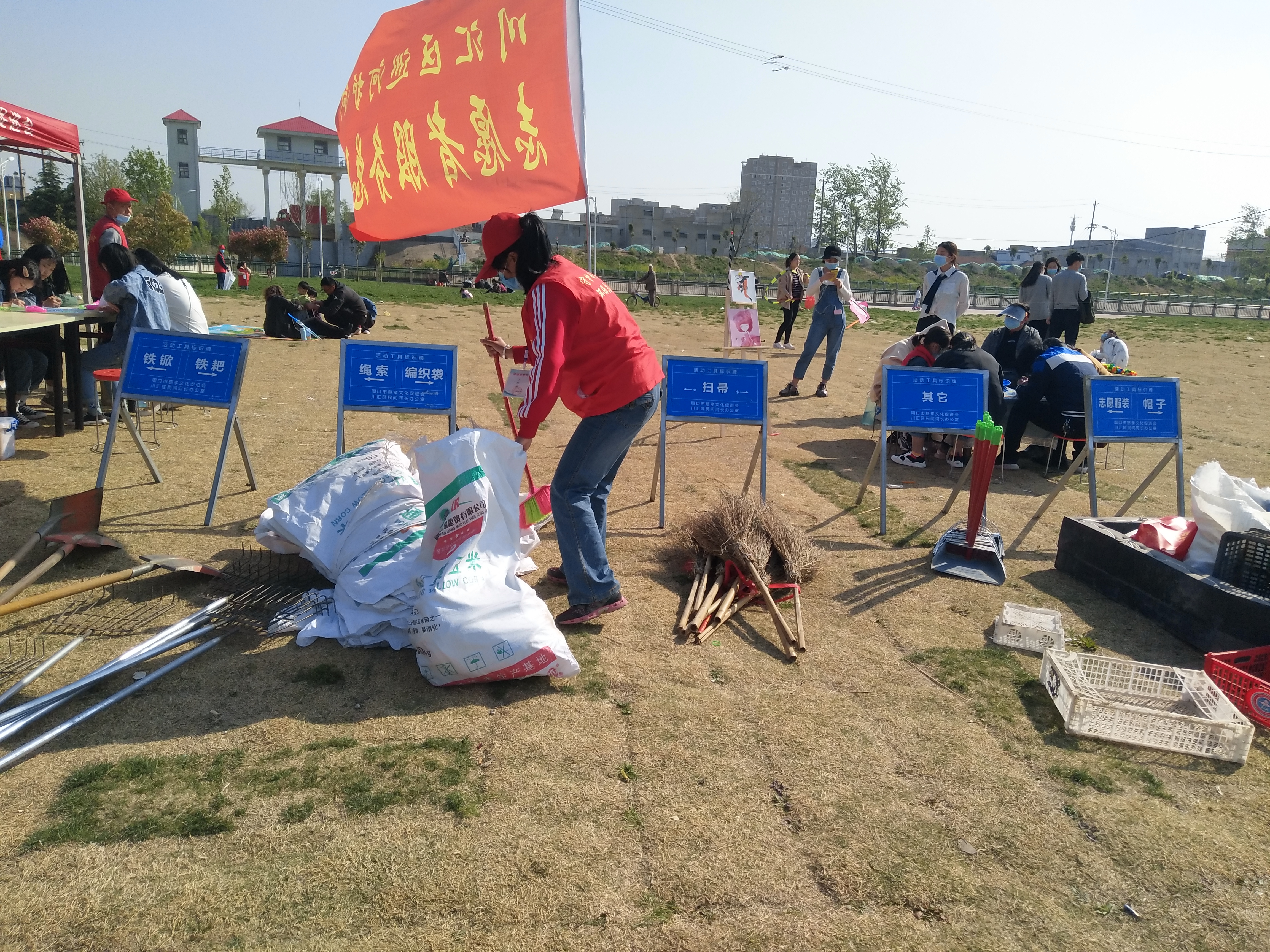 問(wèn)卷棚旁是擺放整齊的河面垃圾清理工具,鐵锨、鐵耙、繩索、編織袋、掃帚、垃圾箱一字排開,寫有“川匯區(qū)巡河護(hù)河”、“志愿者服務(wù)總隊(duì)”字樣的紅旗迎風(fēng)飛揚(yáng)。記者向志愿者借了身衣服,和大家一起等著護(hù)河總指揮孫彩云分工。