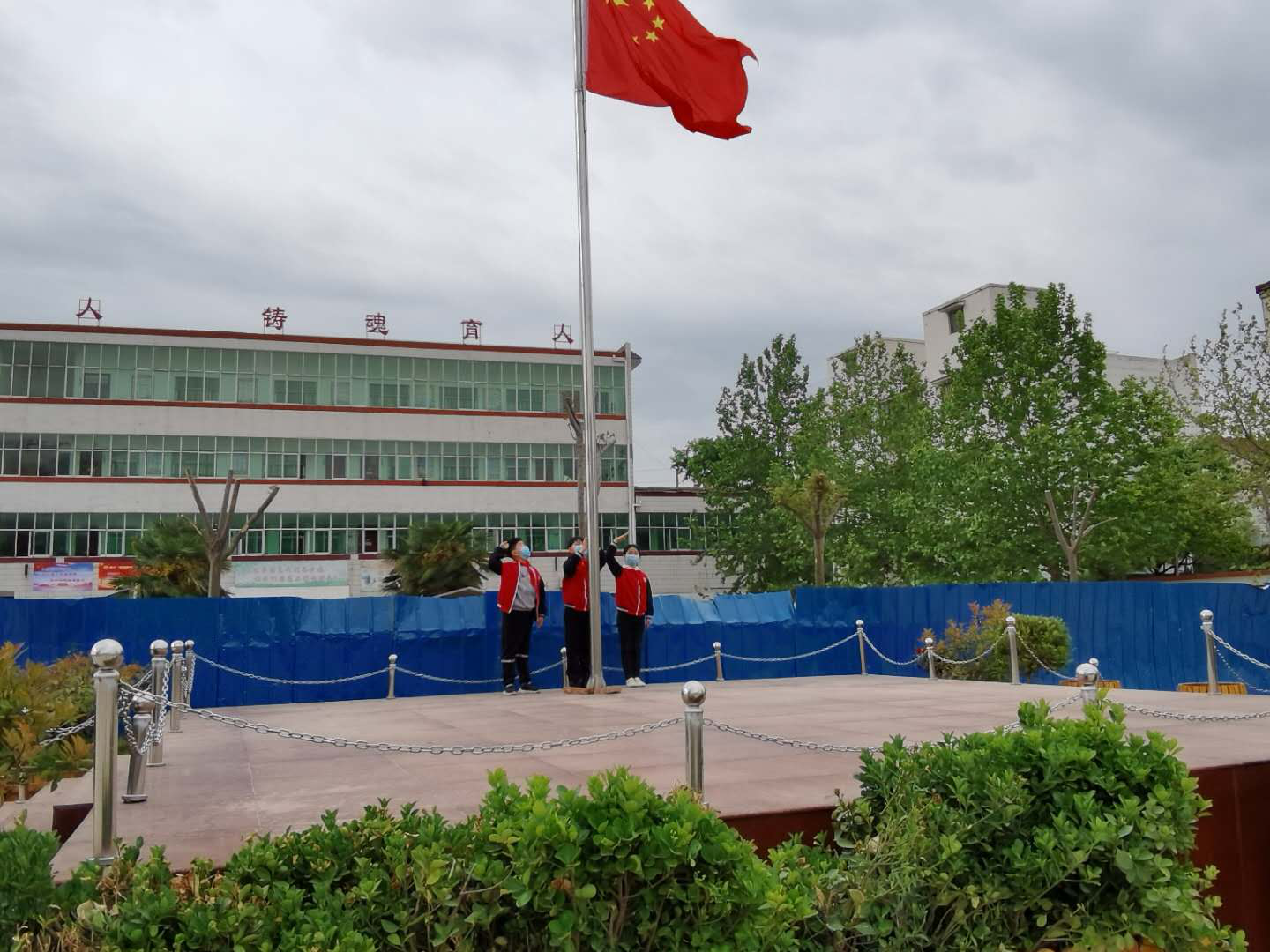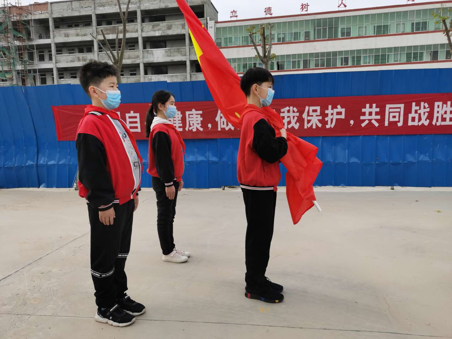 這是一次特殊的升國旗儀式,三名國旗手在操場上將五星紅旗冉冉升起,升旗實況同步轉播到教室內的電視屏幕上,同學們在各自教室里面向國旗莊嚴肅立、齊唱國歌,面向國旗敬禮,在國旗下立下一個志,將來成為一個對社會有貢獻的人,能夠為社會做出突出成績的人。