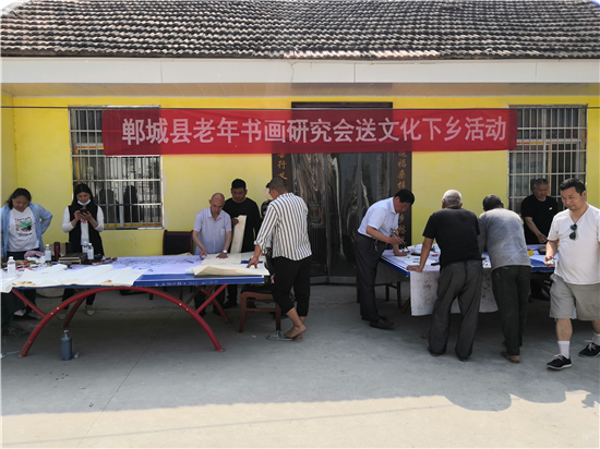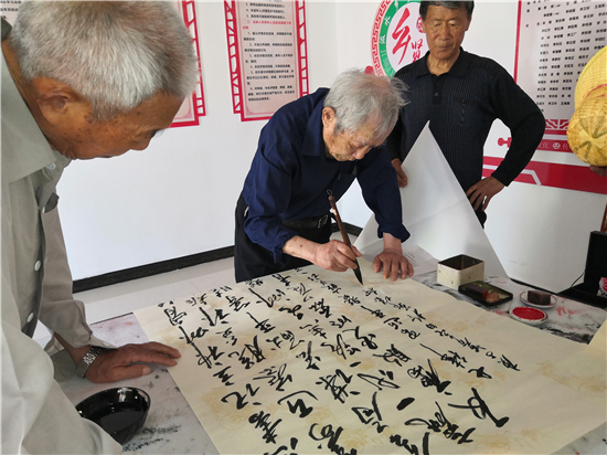 曾慶祥、李宏亮、閆子明、朱好明、單建勛、劉祖祥等9名老年書畫名家一下車,顧不上休息,就紛紛潑墨揮毫,現場為群眾義寫義畫486幅,為村民們獻上一場難得一遇的文化盛宴。雖然天氣炎熱,但是書畫家不辭辛苦,就連已經89歲的李宏亮老師中間也不曾休息片刻,直到中午12:30才收筆,熱火朝天的工作激情贏得了干部群眾的一致好評,也都豎起大拇指為他們點贊!