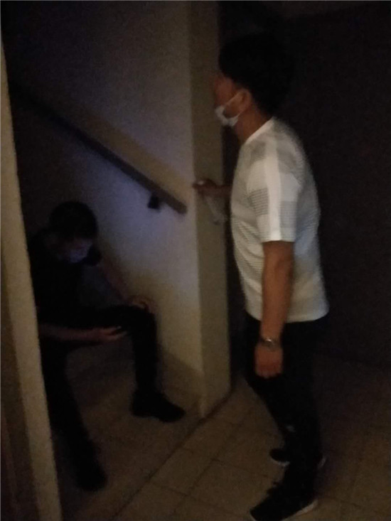 按照事先摸排到的信息,抓捕組民警終于在南京市江寧區(qū)一小區(qū)內找到了嫌疑人的居住地,而嫌疑人卻不在屋內。于是,民警們便在嫌疑人家門“守株待兔”,群里發(fā)來幾張民警坐在樓梯口蹲守照片。等待是漫長的,一直等到晚上10時許,嫌疑人始終沒有出現。民警通過嫌疑人門把手上幾天前的一張廣告單頁判斷,嫌疑人很有可能已經不在此居住,便撤離了蹲守點。