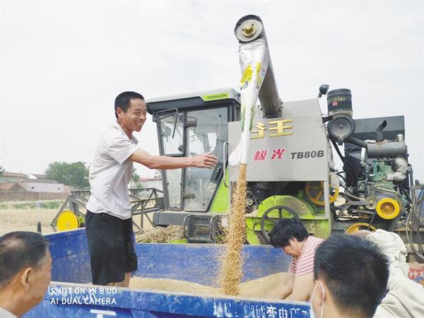日前,我市小麥相繼進入成熟期,田地里一片金黃,滾滾麥浪中收割機來回穿梭,農民已經開始收麥了。圖為5月24日上午,沈丘縣李老莊鄉(xiāng)部分麥子開始收割,飽滿的麥粒從收割機中流出,農民的臉上綻放出笑容。