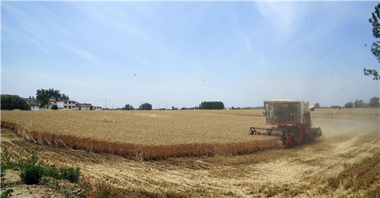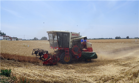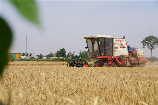 5月28日,在周口市西華縣遲營鄉(xiāng)前喜村,農(nóng)民駕駛收割機在田間收割小麥。 眼下,周口市近千萬畝小麥陸續(xù)開鐮收割,當?shù)剞r(nóng)民搶抓農(nóng)時收割小麥,確保顆粒歸倉。 記者 金月全 攝