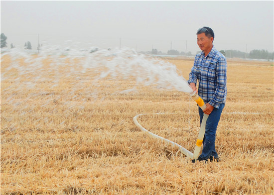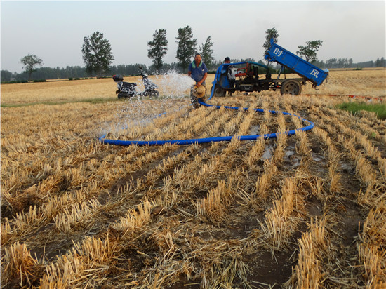 6月6日,沈丘縣周營鎮(zhèn)農(nóng)民正忙著抗旱“造墑”、“補(bǔ)墑”澆水,期待奪取秋糧豐收。 近期來,由于連續(xù)多日高溫?zé)o雨,土壤墑情差,無法播種秋作物。針對當(dāng)下嚴(yán)重的旱情,沈丘縣掀起“雙抗旱”(抗旱保苗、抗旱種秋)高潮。目前,該縣日出動(dòng)勞力1.8萬余人,出動(dòng)各類噴灌機(jī)械26000多臺(套),力保農(nóng)田播種的玉米出苗。
