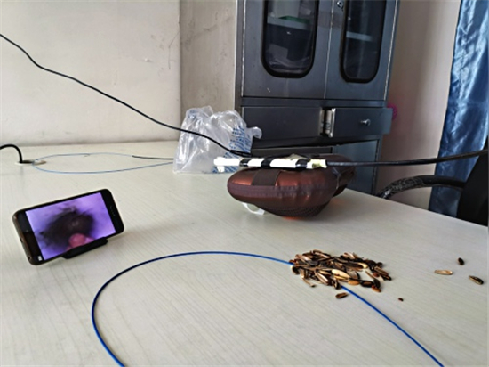記者看到徐醫(yī)生自制的呼吸內(nèi)鏡,胸部是用一個家用電動按摩枕代替的,用來能模擬人的胸部呼吸起伏;按摩枕上固定了兩個用打印紙卷成的小紙筒,用來代替氣管;屏幕是用手機代替的,用WIFI和氣管鏡鏈接,影像可以通過手機屏幕看到;內(nèi)鏡手柄是徐醫(yī)生用膠泥結(jié)合真實設備形狀、重量捏制而成的。當著記者的面,徐醫(yī)生把一小半瓜子皮放入模擬人體氣管的紙筒,在手機屏幕的導航下通過氣管鏡到達異物所在位置,熟練地用異物鉗夾出異物。