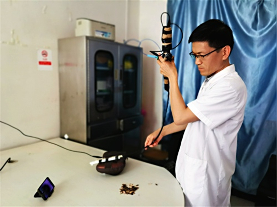 “這是氣管鏡,這是顯示屏,這是氣管,這是模擬人的胸部。”6月5日上午,在市婦幼保健院南院區(qū)兒科診室內(nèi),該科醫(yī)生徐公彥拿著自制的模擬呼吸內(nèi)鏡向記者演示。