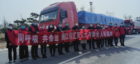 “萬(wàn)眾一心,共抗疫情,周口人民與湖北人民并肩作戰(zhàn)!”2月29日10時(shí),6輛懸掛著紅色條幅的卡車,滿載100噸新鮮蔬菜在周口北高速口集合后,踏上了馳援湖北孝感的征程,單慶峰專門趕到現(xiàn)場(chǎng)為車隊(duì)送行。
