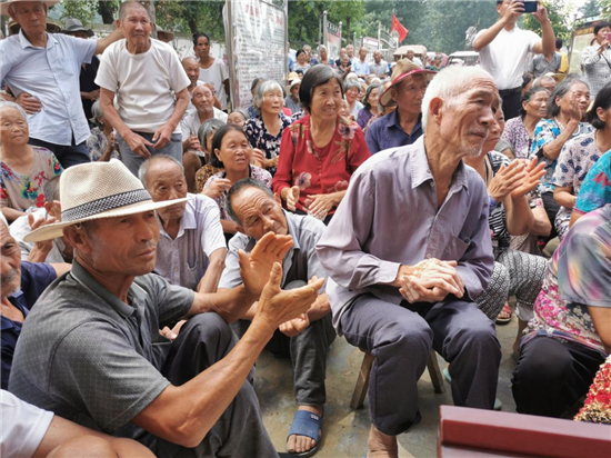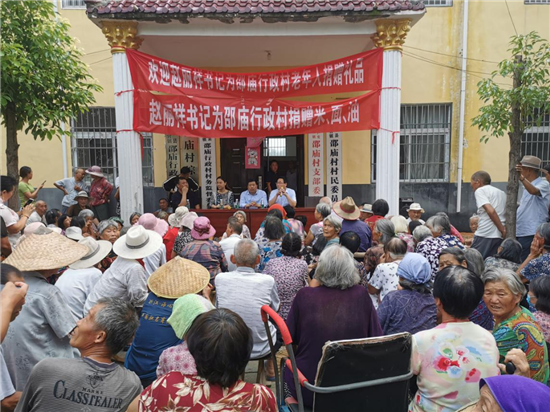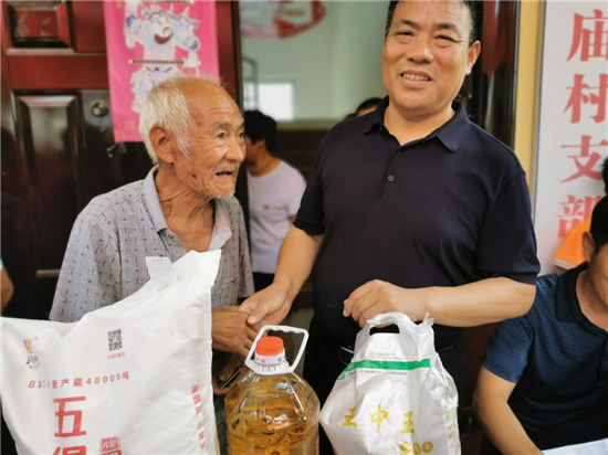 發(fā)放儀式開始后,村干部負責(zé)發(fā)放,老人們有序領(lǐng)取,個個興高采烈,歡笑聲響徹在邵廟村的上空……