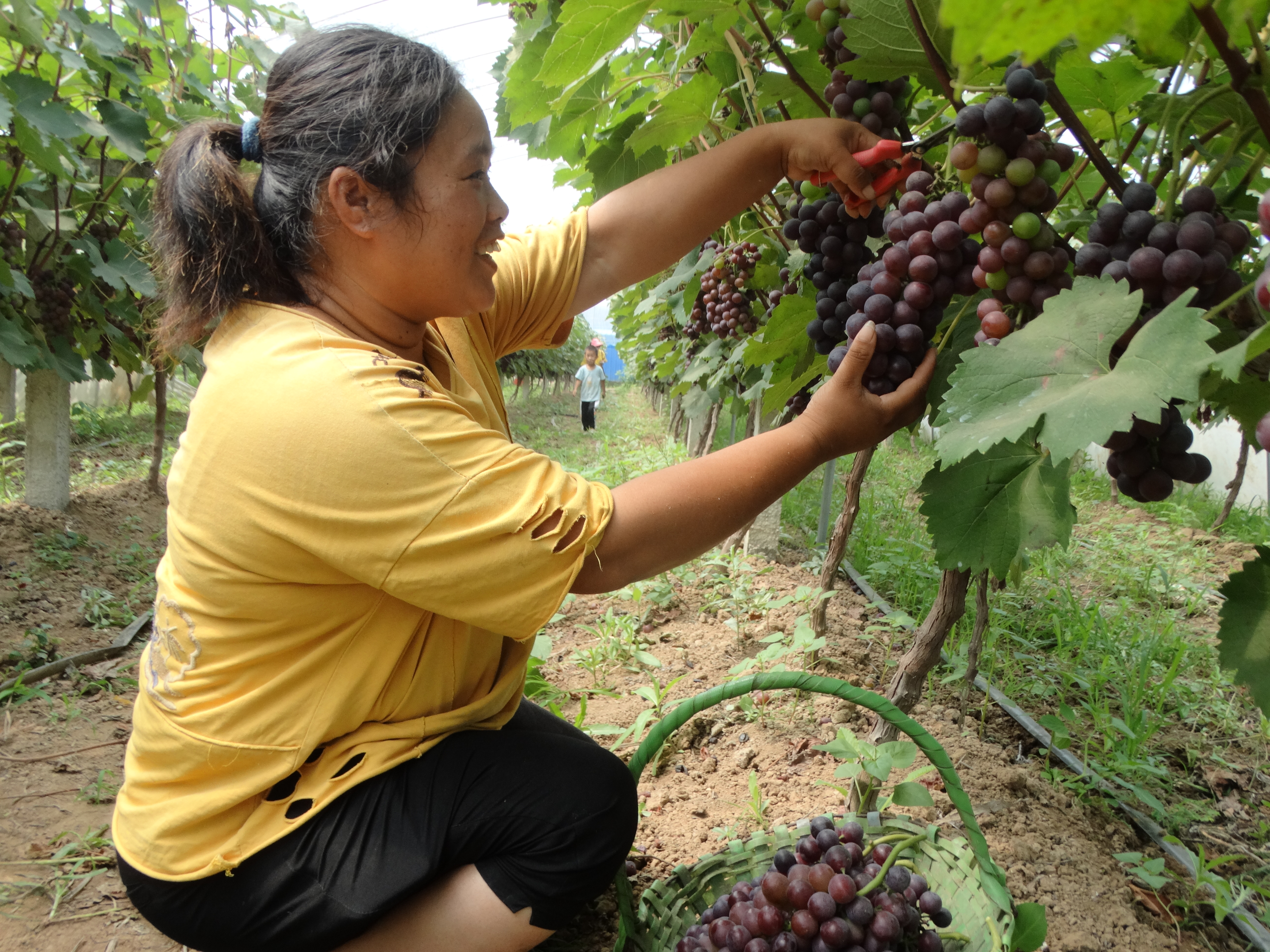 7月20日,沈丘縣周營鎮(zhèn)王寨村返鄉(xiāng)農(nóng)民工王紅兵創(chuàng)辦的大棚生態(tài)葡萄采摘園基地內(nèi),當?shù)夭簧偃罕娫隗w驗休閑采摘葡萄、拍視頻的樂趣。