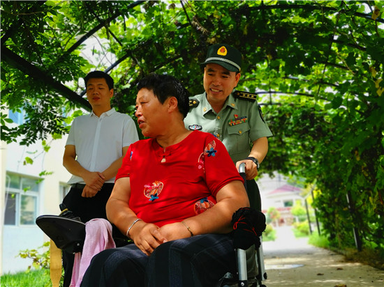 走進(jìn)位于太昊路上的周口市老年護(hù)理院,院內(nèi)整潔有序、花蕊吐香鳥鳴聲聲,小徑通幽處的涼亭內(nèi)三五老人打牌、聊天,一副愜意安詳?shù)纳顖?chǎng)景。在侯國(guó)領(lǐng)母親王玉勤居住的房間內(nèi),李揚(yáng)、孫光濤等人坐在床邊與她聊天談心,看到這么多人來(lái)慰問(wèn)她,王玉勤眼中流下了感動(dòng)的眼淚,她對(duì)慰問(wèn)人員表示感謝,說(shuō)自己來(lái)護(hù)理院近一年來(lái),吃住條件都不錯(cuò),護(hù)理院照顧的無(wú)微不至,身體一天天恢復(fù),閑暇時(shí)還能不依賴輪椅自己走上一段路。她激動(dòng)地說(shuō):“感謝黨和政府的親切關(guān)懷,我最大的愿望是希望倆兒子永遠(yuǎn)聽(tīng)黨的話,在部隊(duì)安心服役、再立新功,用優(yōu)異的成績(jī)回報(bào)黨和政府對(duì)我們?nèi)业年P(guān)愛(ài)?!?/p>