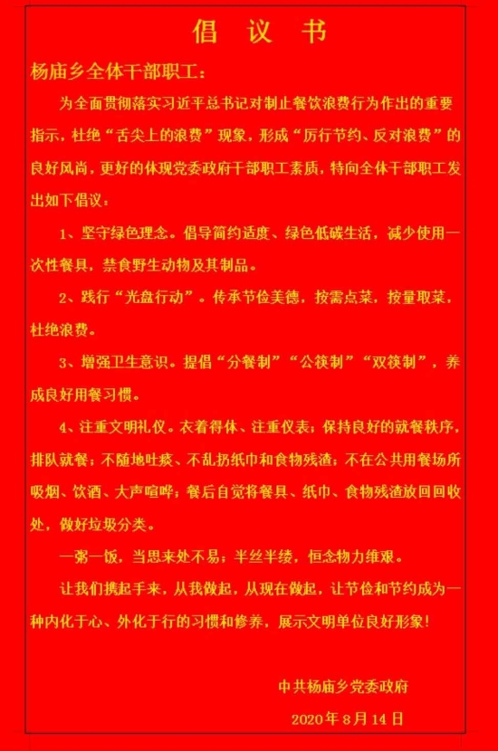 據(jù)楊廟鄉(xiāng)黨委書記聶運(yùn)亨介紹,該鄉(xiāng)積極響應(yīng)總書記號(hào)召,向全鄉(xiāng)干部發(fā)出了堅(jiān)守綠色理念、踐行光盤行動(dòng)、增強(qiáng)衛(wèi)生意識(shí)、注重文明禮儀等四個(gè)方面的倡議,讓全鄉(xiāng)干部從我做起,從現(xiàn)在做起,使勤儉節(jié)約成為習(xí)慣和修養(yǎng)。