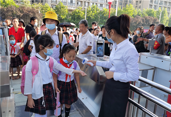 9月7日早上,周口市文昌小學(xué)的學(xué)生有序排隊測量體溫后進入學(xué)校。據(jù)文昌小學(xué)校長介紹,全市中小學(xué)實行錯峰開學(xué)。今天是小學(xué)開學(xué)時間,文昌小學(xué)學(xué)生每個年級實行錯時上下學(xué),學(xué)生入校要測體溫,并為一年級新生舉辦了主題為“夢從這里啟航”的“迎新儀式”。