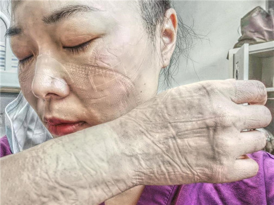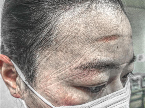 因?yàn)樾鹿诜窝椎膹?qiáng)傳染性,胡奔奔每次去病區(qū)上班都要全副武裝,而且為保證在6個(gè)小時(shí)的工作時(shí)間內(nèi)不被暴露,不能去衛(wèi)生間,不能喝水,還要穿上成人紙尿褲以防萬(wàn)一。這樣下來(lái),汗?jié)褚路浅J拢蚁掳嗪竺摰舴雷o(hù)裝備后,她原本清秀白皙的臉上,滿是深深的皺褶,久久難以恢復(fù),惹人心疼。給家人報(bào)平安時(shí),胡奔奔甚至不敢視頻聊天,只能語(yǔ)音安慰家人。