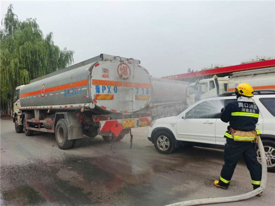 當日上午10時,商水交警大隊指揮中心接到報警:在商水縣興商大道與陳勝大道交叉口西、湯莊油庫處,一輛轎車與一輛?;饭捃囎肺蚕嘧?,正常罐體損壞,危化品泄露起火,轎車駕駛室變形,駕駛?cè)吮焕к噧?nèi),如不及時救援,駕駛?cè)擞猩kU,另外因事故現(xiàn)場臨近湯莊油庫,如不及時處置可能發(fā)生爆炸,后果不堪設(shè)想。