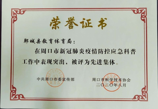 鄲城縣教體局獲全市疫情防控應急科普兩項表彰