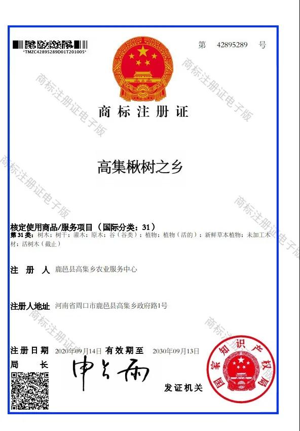 近日,從鹿邑縣高集鄉(xiāng)政府傳出喜訊,由該鄉(xiāng)農(nóng)業(yè)服務(wù)中心注冊(cè)的“高集楸樹之鄉(xiāng)”商標(biāo),已獲得國(guó)家知識(shí)產(chǎn)權(quán)局批準(zhǔn),注冊(cè)商標(biāo)證書號(hào)為42895289。該商標(biāo)證書顯示,該商品使用服務(wù)的項(xiàng)目為國(guó)標(biāo)31類,有樹木、樹干、灌木、原木、植物、活樹木等類型,商標(biāo)地址為河南省周口市鹿邑縣高集鄉(xiāng)政府路1號(hào),商標(biāo)名稱為高集楸樹之鄉(xiāng),成為全省唯一一家以鄉(xiāng)鎮(zhèn)命名的農(nóng)產(chǎn)品商標(biāo)產(chǎn)地。自此,楸樹之鄉(xiāng)高集將會(huì)邁著更加矯健的步伐走出河南、走向全國(guó)。