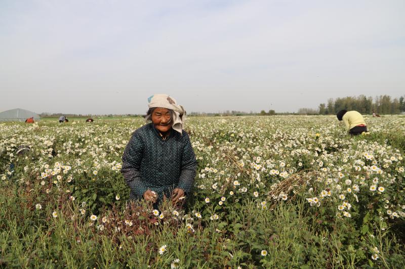 “這活兒輕,像摘棉花一樣,權(quán)當(dāng)閑著沒事兒來玩兒了。我這年齡大了,不比他們年輕人,一天才掙五六十文兒?!?6歲的脫貧致富戶晉秀云來自晉老家行政村閆莊村,和老伴陳克平相依相伴。就這樣在村里打個零工,幫助種植合作社除草、施肥、摘花、澆水,再加上黨委政府的照顧,二人順利脫貧。“關(guān)鍵是干這活兒甜蜜呀,聽說這菊花賣到外地都是有錢人泡茶喝的,俺這貧困戶能嘗到第一道鮮兒。”說著,晉秀云挑一朵開得艷的菊花放進(jìn)口中,臉上露出了幸福的笑容。
