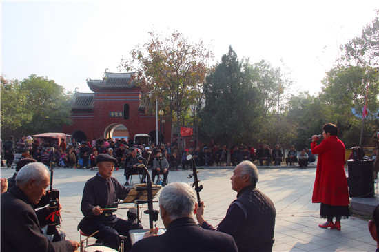 11月10日,戲迷朋友在商水縣郝崗鎮(zhèn)北社村千年古塔旁表演戲曲節(jié)目。初冬時(shí)節(jié),暖陽普照,壽圣寺古塔附近的戲迷和樂器愛好者自發(fā)來到千年古塔旁表演戲曲節(jié)目,為當(dāng)?shù)厝罕娝蜕暇实奈幕蟛?,進(jìn)一步活躍了農(nóng)村文化生活。①15周口日?qǐng)?bào)·周道客戶端記者付永奇 通訊員 呂耀光 攝