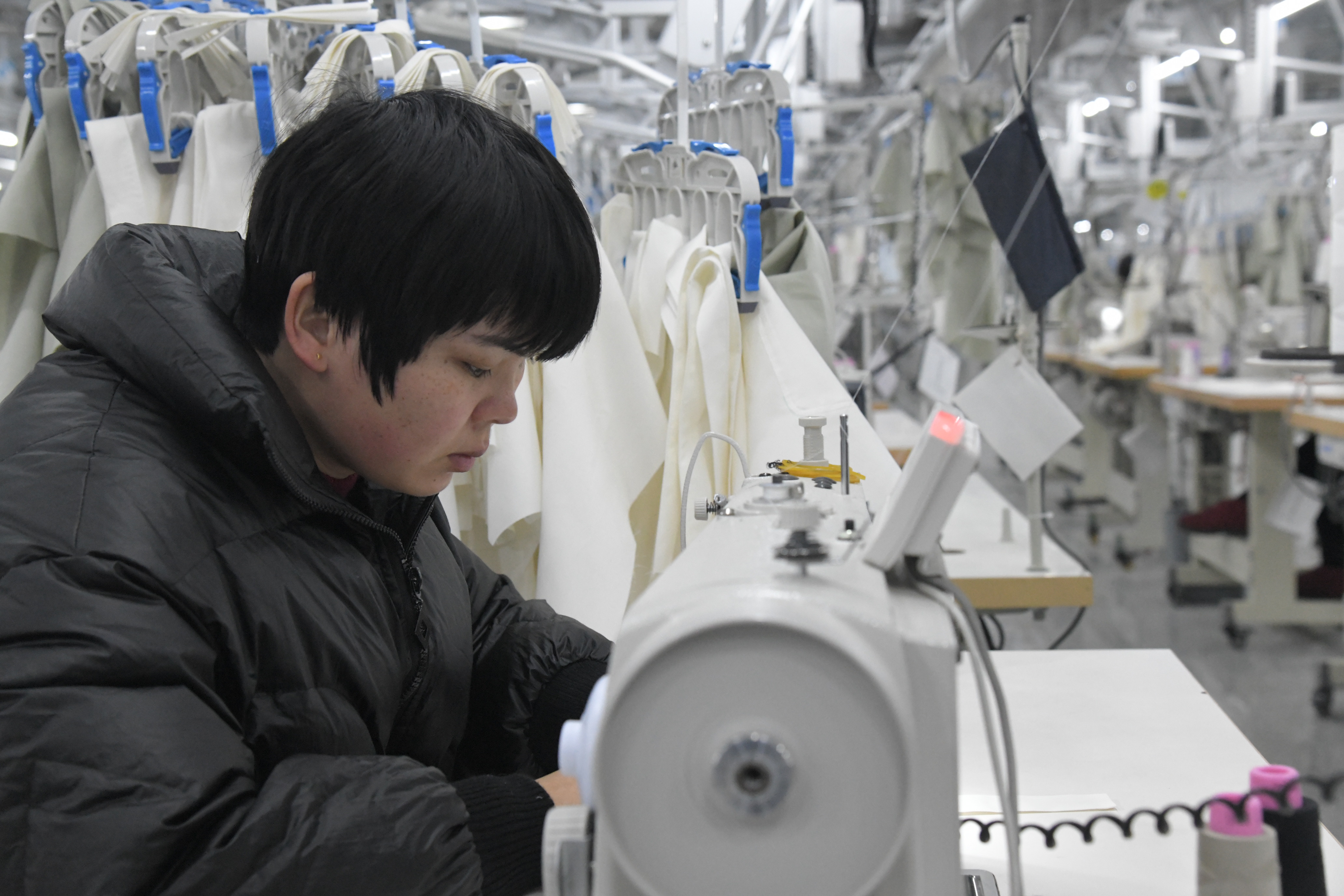 12月17日,在商水縣產(chǎn)業(yè)集聚區(qū)雅戈爾盛泰紡織工業(yè)園一現(xiàn)代化車間內(nèi),紡織女工正在制作外貿(mào)訂單服裝。雅戈爾盛泰紡織工業(yè)園是周口市重點招商引資企業(yè),總投資48億元,占地2000畝,是集棉紡、面料、印染、成衣、進出口貿(mào)易、跨國經(jīng)營于一體的大型綜合生產(chǎn)基地,長期代加工雅戈爾、PVH等國際品牌。該項目一期已經(jīng)投產(chǎn),全部建成后將填補我市紡織服裝行業(yè)缺少高端品牌的空白,促進我市輕紡工業(yè)的發(fā)展。