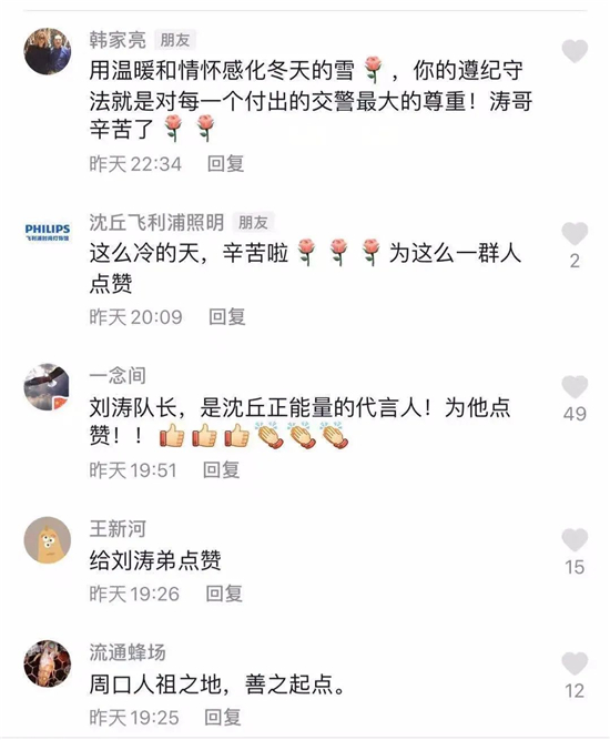2021年元旦,記者聯(lián)系聯(lián)系上了視頻中的主人公——沈丘縣交警大隊(duì)城市中隊(duì)劉濤中隊(duì)長(zhǎng),雖然是元旦假日,他依然堅(jiān)守在崗位上,他告訴記者,這是一名交警工作的日常,沒(méi)有想到自己和同事們的一個(gè)小舉動(dòng)能獲得無(wú)數(shù)網(wǎng)友好評(píng),這給了他們?cè)谝院蠊ぷ髦懈蟮膭?dòng)力,劉濤表示,風(fēng)雪無(wú)阻,滾滾車(chē)流中,他將為全縣人民的安全出行繼續(xù)堅(jiān)守崗位。