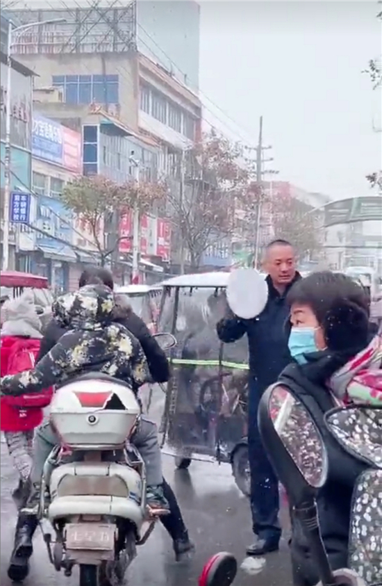 走在路上,雪花片子就往臉上撲,迎面的小風(fēng)像刀子一樣,即使你不愿意,也要跟你進(jìn)行親密接觸。到沈丘縣回民小學(xué)東邊的十字路口,各路送娃大軍從四面八方涌來(lái),那真是車(chē)來(lái)車(chē)往,熙熙攘攘。兩輪的三輪的四輪的,瞬間一起往學(xué)校門(mén)口涌去。原本送完娃多少都會(huì)堵一會(huì),今天竟然沒(méi)有堵車(chē)!后來(lái)才知道學(xué)校這邊有個(gè)警察很早就來(lái)現(xiàn)場(chǎng)指揮交通。
