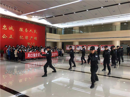 1月10日是首個(gè)“中國(guó)人民警察節(jié)”和“110”誕生35周年。小記者應(yīng)邀提前走進(jìn)市公安局參觀(guān)體驗(yàn)。9日上午,在二樓大廳,特警隊(duì)員進(jìn)行了擒敵拳表演,現(xiàn)場(chǎng)掌聲經(jīng)久不息。
