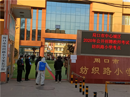 1月10日,周口市中心城區(qū)2020年公開(kāi)招聘教師考試,考試時(shí)間是一天。當(dāng)天下午,記者在周口市中心城區(qū)2020年公開(kāi)招聘教師考試紡織路小學(xué)考點(diǎn)看到,工作人員在做好考務(wù)工作的同時(shí)還做好疫情防控工作。圖為工作人員做防疫消殺。