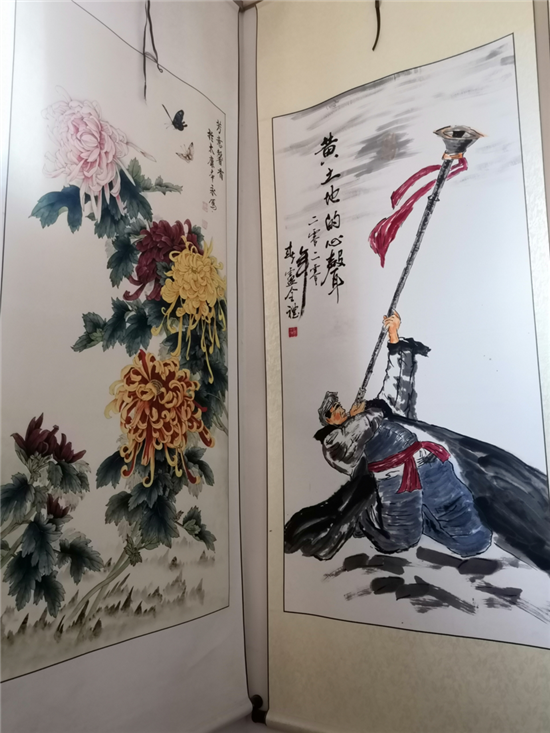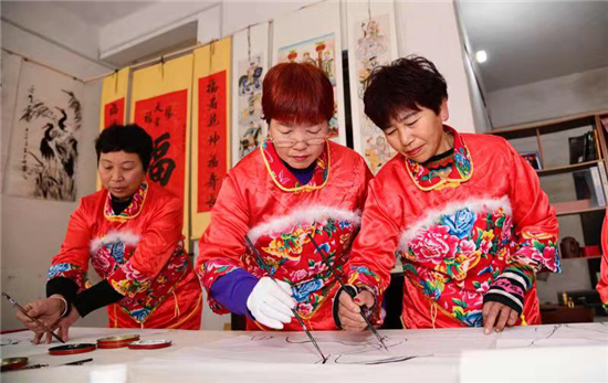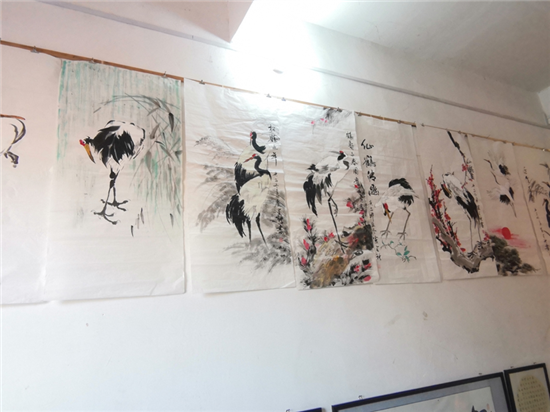 在建豪工作室的斜對(duì)面,是50歲村黨支部書記、村文聯(lián)主席盧全禮的書畫工作室。盧全禮書畫兼擅,還會(huì)武術(shù)、木刻、舞獅子,是附近有名的才子。記者看到,他為太康縣第二屆農(nóng)民豐收節(jié)創(chuàng)作的中國畫《黃土地的心聲》,以該村嗩吶吹奏藝人幸福而夸張的演出情景,歌頌農(nóng)村脫貧攻堅(jiān)取得的巨大成果,極具鄉(xiāng)土氣息。在他的畫室,滿身文藝范兒的五西村民,正以新時(shí)代松鶴延年吉祥農(nóng)民畫,齊心打造中原畫鶴第一村。經(jīng)過培訓(xùn)的農(nóng)村大嫂大媽執(zhí)筆齊描畫,一時(shí)鶴鳴九皋,翩翩欲飛。