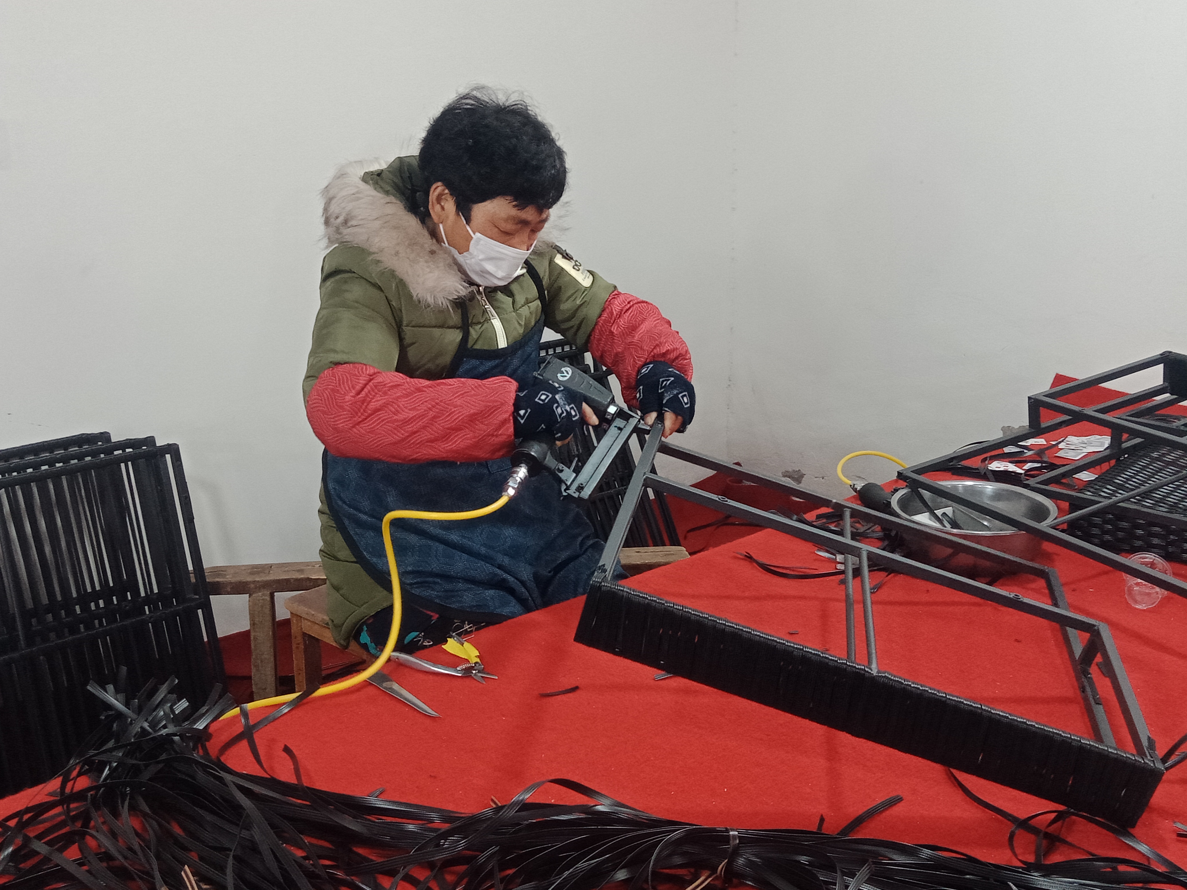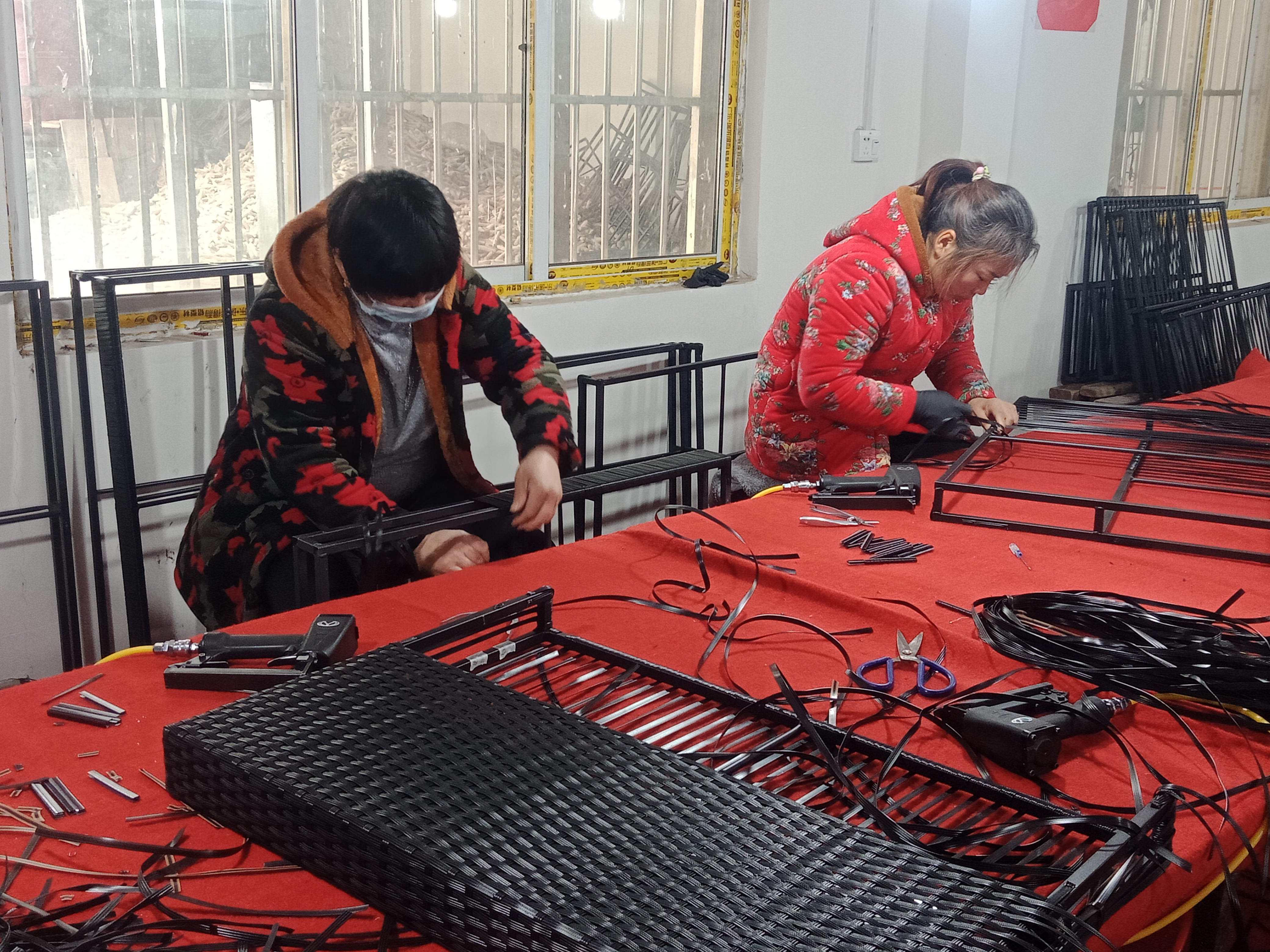 在加工車間,記者看到十幾個(gè)中年婦女在不停忙碌著。有拉鋼的、有編織的,有收尾的,顯得很是輕松愉快。據(jù)說(shuō),熟練工每天可以加工十多個(gè)戶外藤編沙發(fā)雙面靠背,按件計(jì)算,平均每天能掙六七十元,多的可掙百元。